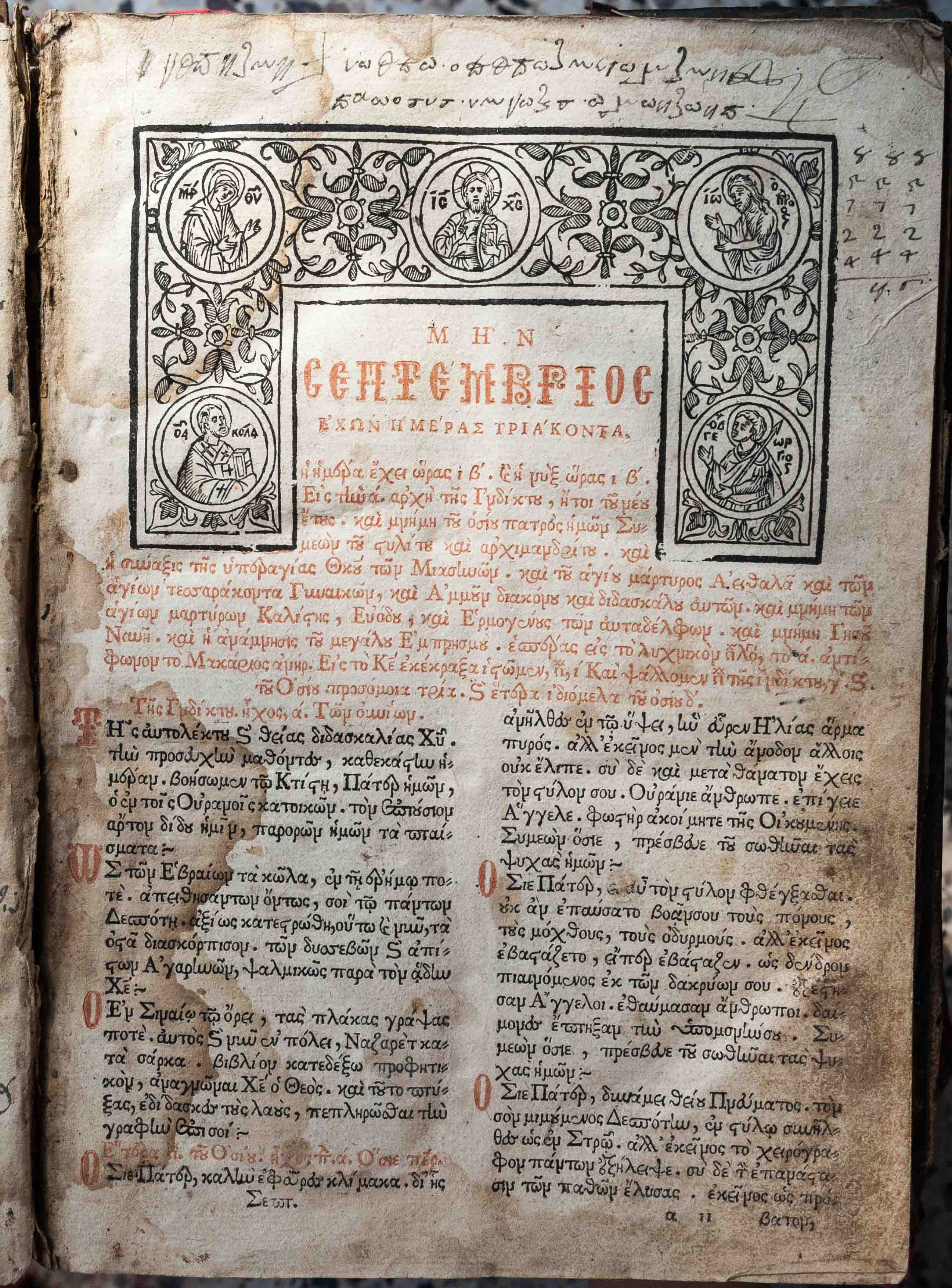 Βιβλίον τοῦ Σεπτεμβρίου μηνὸς : περιέχον τὴν πρέπουσαν αὐτῷ ἅπασαν Ἀκολουθίαν