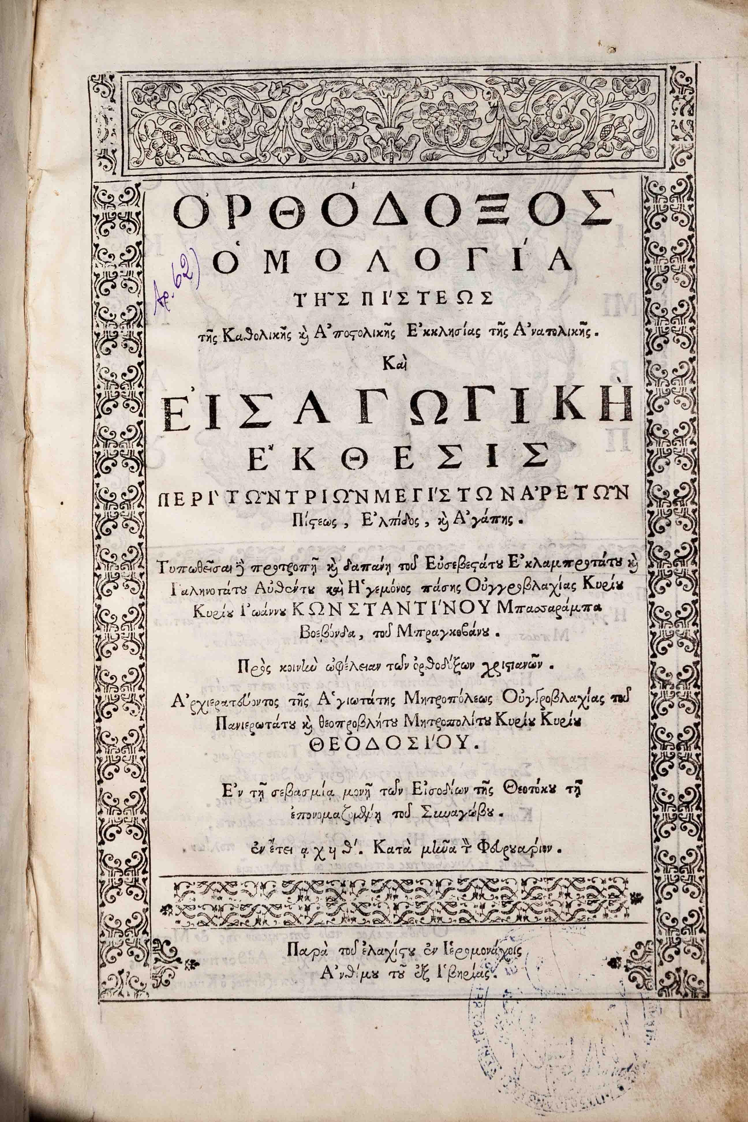 Ὀρθόδοξος Ὁμολογία τῆς πίστεως τῆς Καθολικῆς καὶ Ἀποστολικῆς Ἐκκλησίας τῆς Ἀνατολικῆς καὶ Εἰσαγωγικὴ Ἔκθεσις περὶ τῶν τριῶν μεγίστων ἀρετῶν πίστεως, ἐλπίδος καὶ ἀγάπης