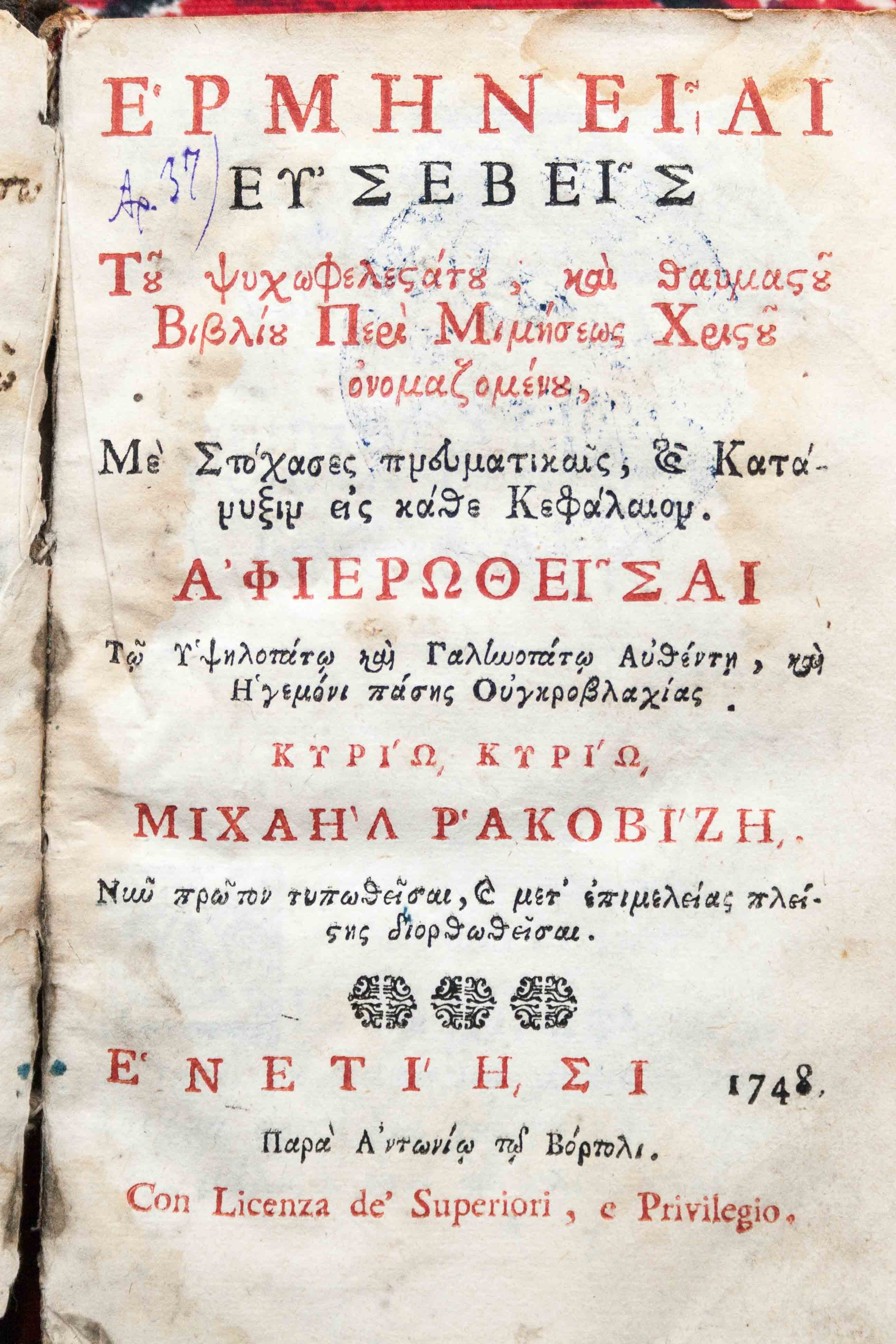 Ἑρμηνεῖαι εὐσεβεῖς τοῦ ψυχωφελεστάτου καὶ θαυμαστοῦ βιβλίου περὶ μιμήσεως Χριστοῦ ὀνομαζομένου : μὲ στόχασες πνευματικαῖς καὶ κατάνυξιν εἰς κάθε κεφάλαιον, ἀφιερωθεῖσαι τῷ ὑψηλοτάτῳ καὶ γαληνοτάτῳ αὐθέντῃ καὶ ἡγεμόνι πάσης Οὐγκροβλαχίας κυρίῳ κυρίῳ Μιχαὴλ Ῥακοβίζῃ, νῦν πρῶτον τυπωθεῖσαι καὶ μετ’ ἐπιμελείας πλείστης διορθωθεῖσαι