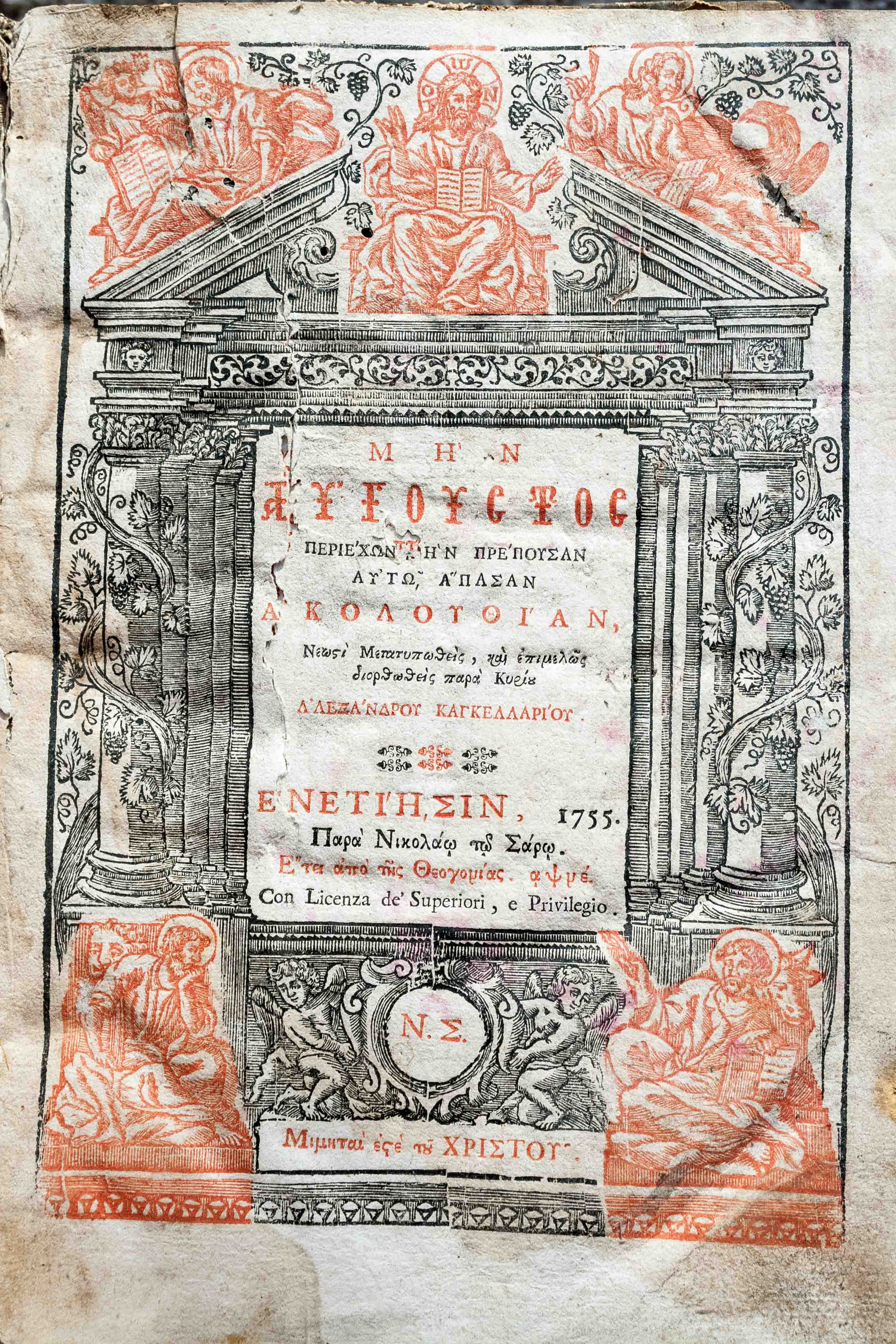 Μὴν Αὔγουστος : περιέχων τὴν πρέπουσαν αὐτῷ ἅπασαν Ἀκολουθίαν