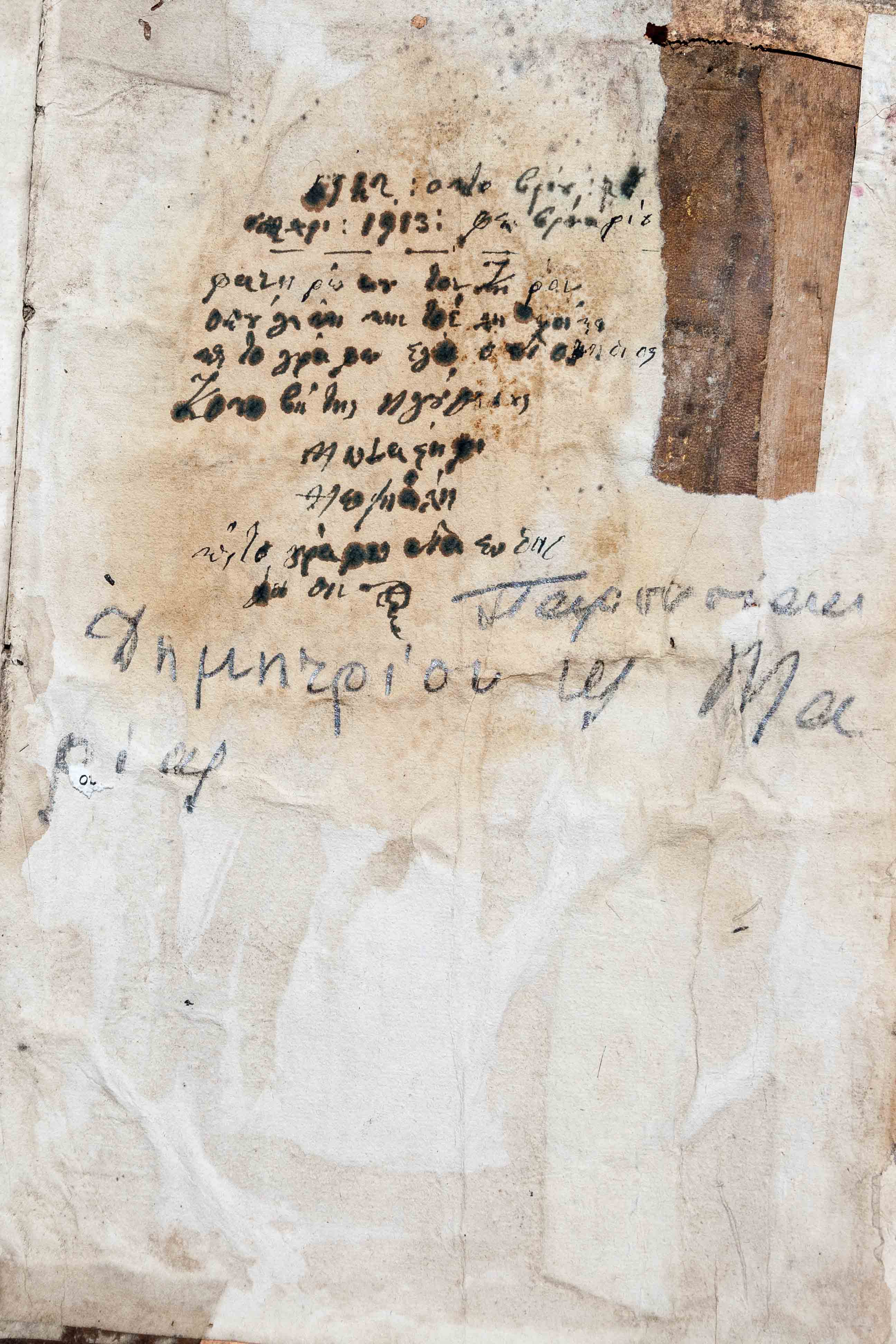 Abstract: Η στάχωση αποτελείται από ξύλινες πινακίδες επενδυμένες με δέρμα. Ένα τετράγωνο σαν παράθυρο ζωγραφισμένο, στα παράφυλλα της αρχής και στο οπισθόφυλλο υπάρχει (φωτ. 4984). Ενθυμήσεις με ημερομηνία Φεβρουάριος 1913, στο verso του οπισθόφυλλου (φωτ. 4982) και στη σ. 160 (φωτ. 4983). Αποτελεί μέρος (εγγραφή 18) της πτυχιακής εργασίας Τα παλαίτυπα της Ιεράς Μονής Τιμίου Προδρόμου Βεροίας, της Ευθυμίας Αθανασιάδου, φοιτήτριας του Τμήματος Βιβλιοθηκονομίας και Συστημάτων Πληροφόρησης ΑΤΕΙΘ.