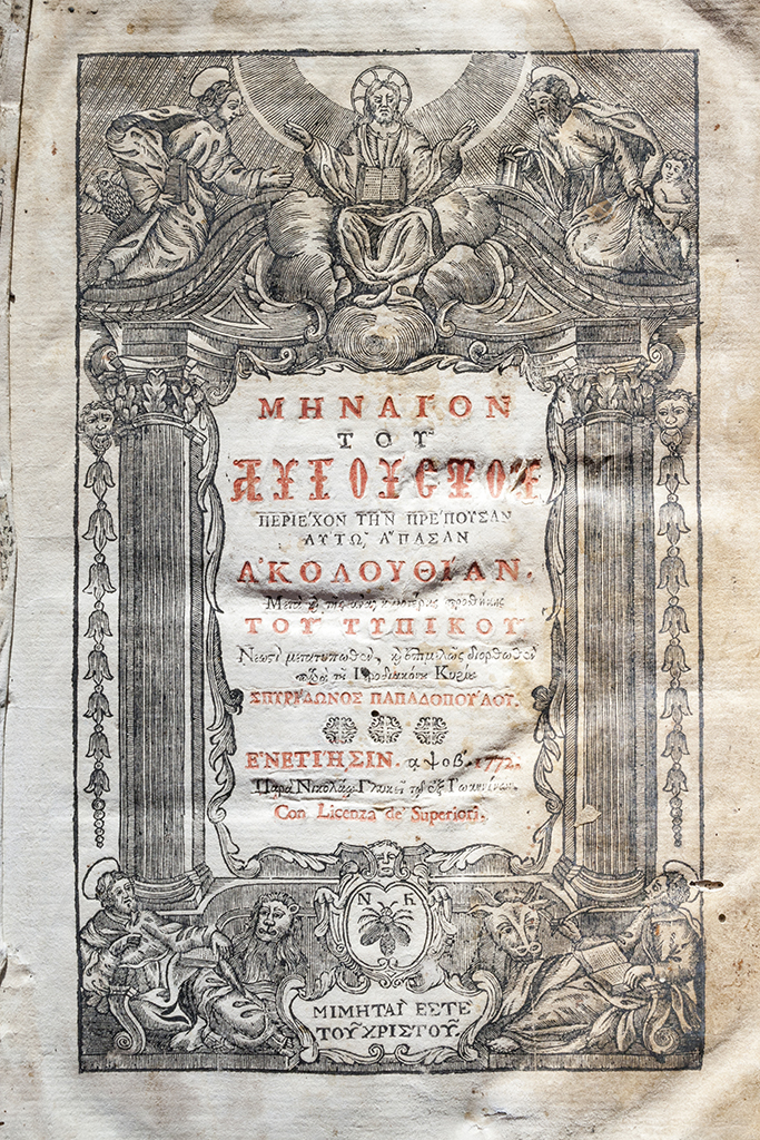 Μηναῖον τοῦ Αὐγούστου : περιέχον τὴν πρέπουσαν αὐτῷ ἅπασαν Ἀκολουθίαν μετὰ καὶ τῆς ἀναγκαιοτέρας προσθήκης τοῦ Τυπικοῦ