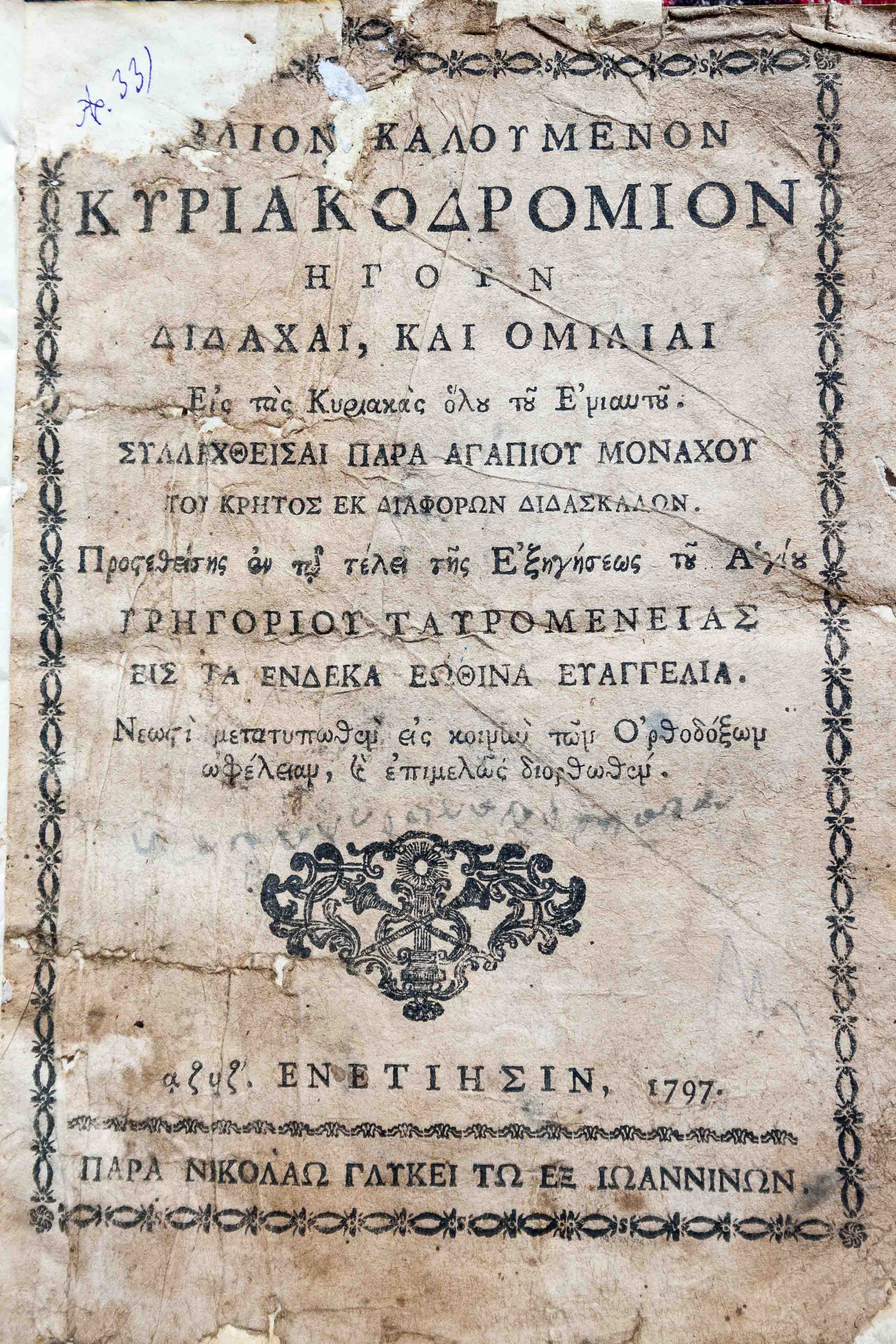 Βιβλίον καλούμενον Κυριακοδρόμιον : ἤγουν διδαχαὶ καὶ ὁμιλίαι εἰς τὰς Κυριακὰς ὅλου τοῦ ἐνιαυτοῦ