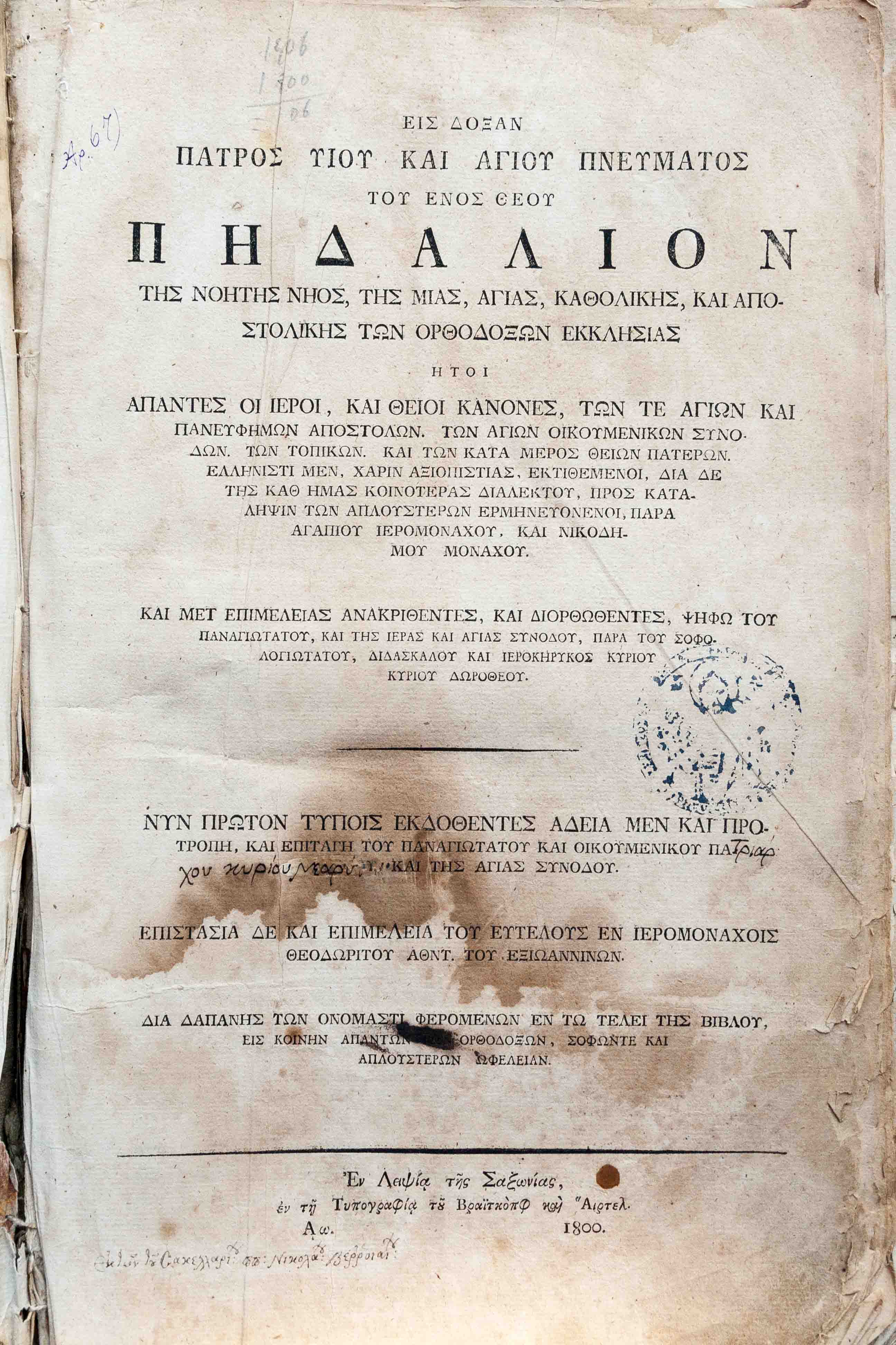 Εἰς δόξαν Πατρὸς Υἱοῦ καὶ Ἁγίου Πνεύματος τοῦ ἑνὸς Θεοῦ Πηδάλιον τῆς νοητῆς νηός, τῆς μίας, ἁγίας, καθολικῆς καὶ ἀποστολικῆς τῶν ὀρθοδόξων Ἐκκλησίας : ἤτοι ἅπαντες οἱ ἱεροὶ ...
