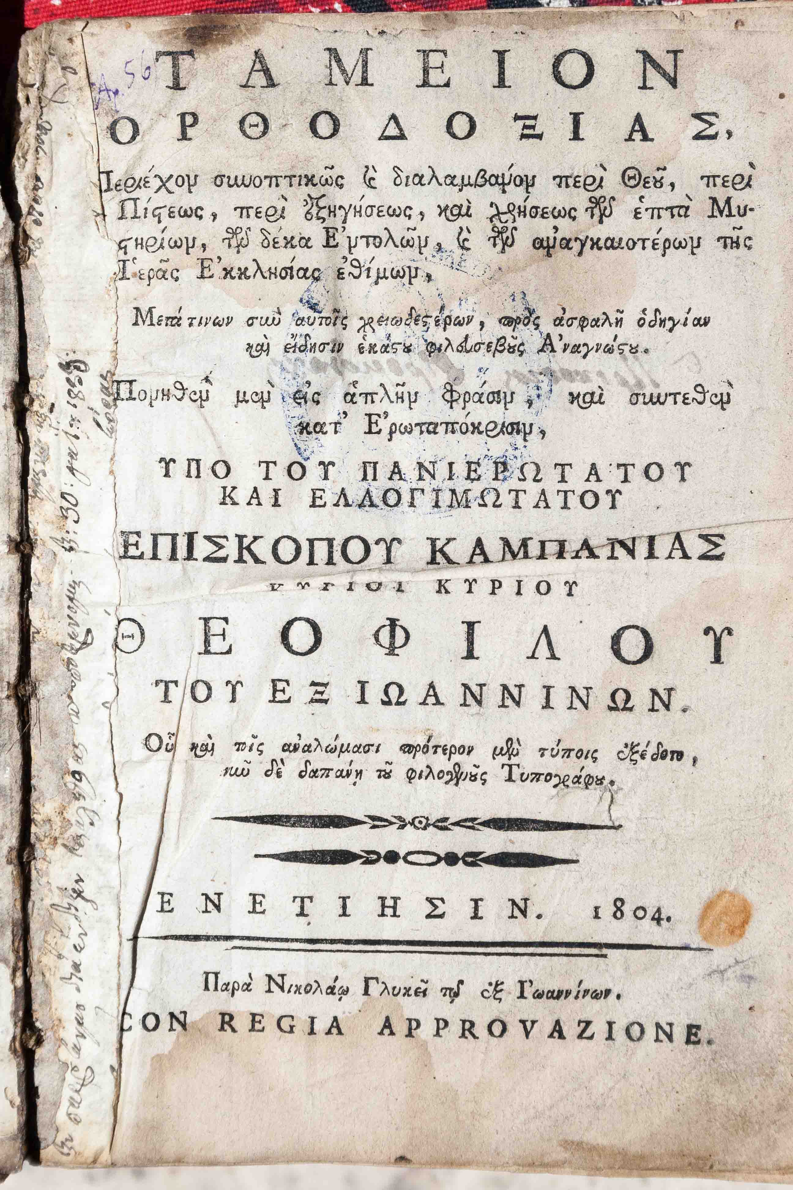 Ταμεῖον Ὀρθοδοξίας : περιέχον συνοπτικῶς καὶ διαλαμβάνον περὶ Θεοῦ, περὶ πίστεως, περὶ ἐξηγήσεως καὶ χρήσεως τῶν ἑπτὰ μυστηρίων, τῶν δέκα ἐντολῶν, καὶ τῶν ἀναγκαιοτέρων τῆς ἱερᾶς Ἐκκλησίας ἐθίμων, μετά τινῶν σὺν αὐτοῖς χρειωδεστέρων πρὸς ἀσφαλῆ ὁδηγίαν καὶ εἴδησιν ἑκάστου φιλευσεβοῦς ἀναγνώστου