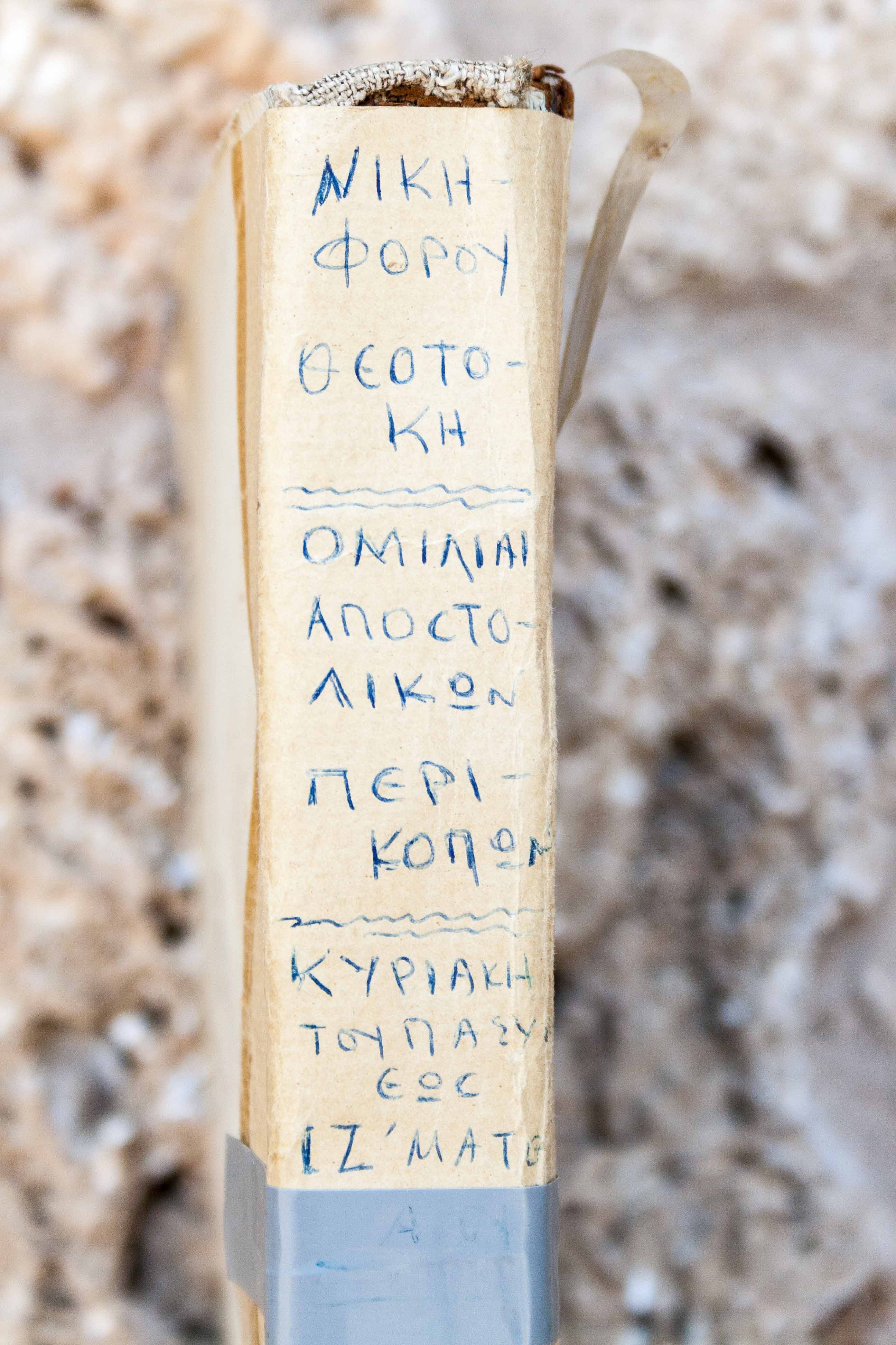 Abstract: Η στάχωση αποτελείται από πινακίδες χαρτονιού με δερμάτινη επικάλυψη. Στάχωση εξώφυλλου (φωτ. 5780). Στη ράχη σε πρόχειρο χαρτί: Νικηφόρου Θεοτόκη-ομιλίαι αποστολικών περικοπών-Κυριακή του Πάσχα έως ΙΖ΄ Ματθαίου (φωτ. 5779). Λείπει το οπισθόφυλλο (φωτ. 5782). Αποτελεί μέρος (εγγραφή 52) της πτυχιακής εργασίας Τα παλαίτυπα της Ιεράς Μονής Τιμίου Προδρόμου Βεροίας, της Ευθυμίας Αθανασιάδου, φοιτήτριας του Τμήματος Βιβλιοθηκονομίας και Συστημάτων Πληροφόρησης ΑΤΕΙΘ.