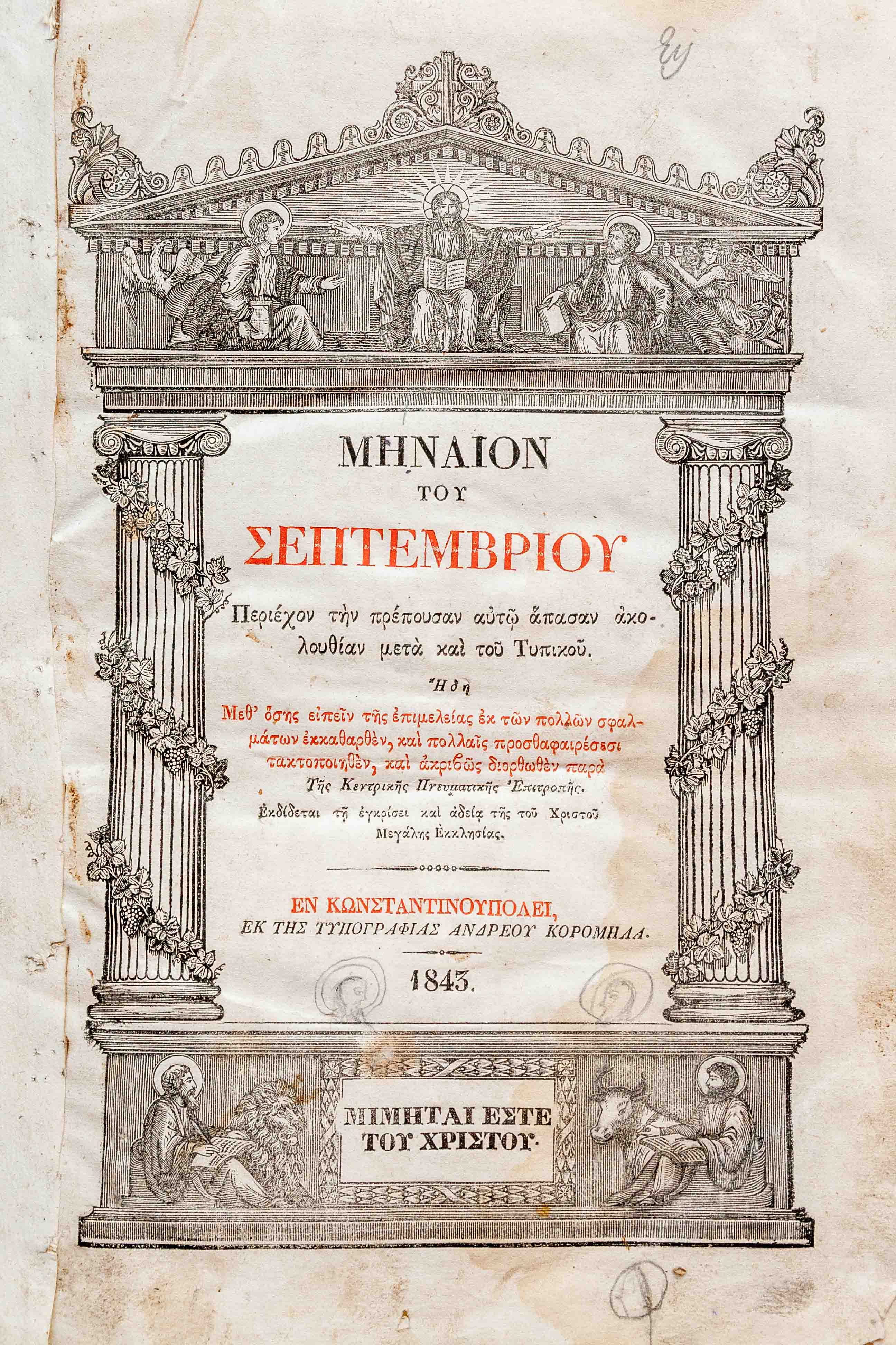 Μηναῖον τοῦ Σεπτεμβρίου : περιέχον τὴν πρέπουσαν αὐτῷ ἅπασαν Ἀκολουθίαν μετὰ καὶ τοῦ Τυπικοῦ
