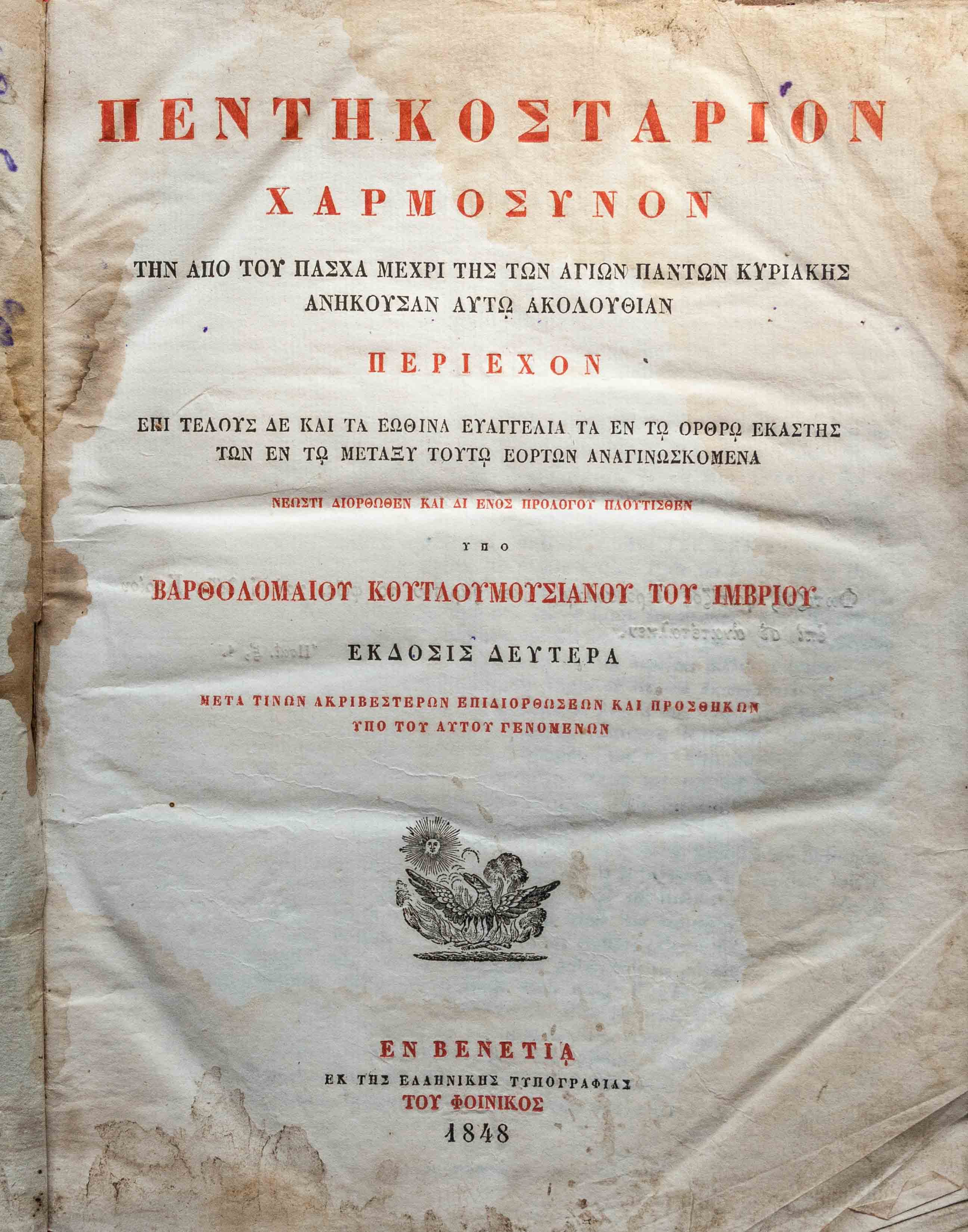 Πεντηκοστάριον χαρμόσυνον : τὴν ἀπὸ τοῦ Πάσχα μέχρι τῆς τῶν Ἁγίων Πάντων Κυριακῆς ἀνήκουσαν αὐτῷ Ἀκολουθίαν, περιέχον ἐπὶ τέλους δὲ καὶ τὰ ἑωθινὰ Εὐαγγέλια, τὰ ἐν τῷ Ὄρθρῳ ἑκάστης τῶν ἐν τῷ μεταξὺ τούτῳ ἑορτῶν ἀναγινωσκόμενα