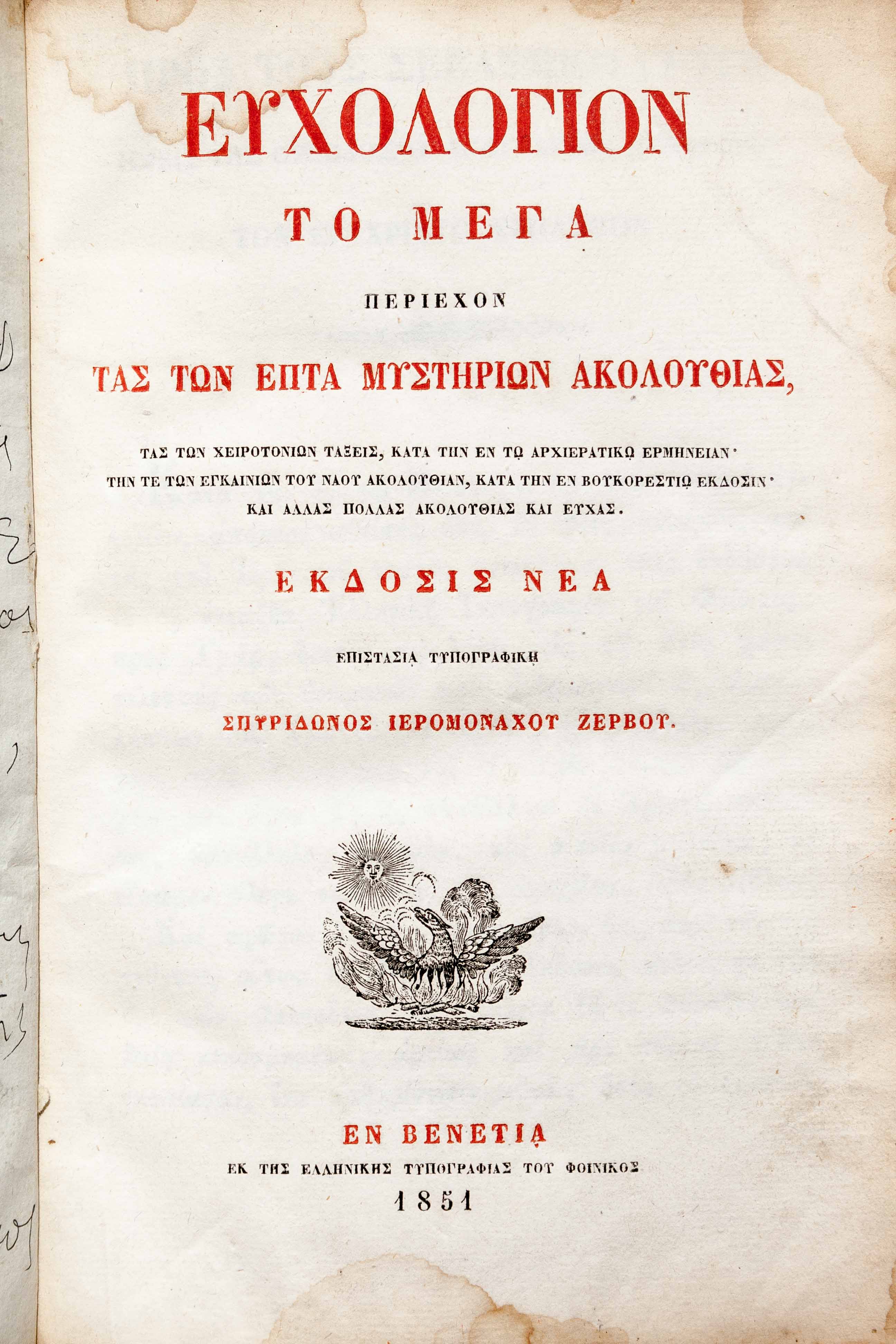 Εὐχολόγιον τὸ Μέγα : περιέχον τὰς τῶν ἑπτὰ μυστηρίων ἀκολουθίας, τὰς τῶν χειροτονιῶν τάξεις, κατὰ τὴν ἐν τῷ ἀρχιερατικῷ ἑρμηνείαν τὴν τε τῶν ἐγκαινίων τοῦ ναοῦ ἀκολουθίαν κατὰ τὴν ἐν Βουκουρεστίῳ ἔκδοσιν καὶ ἄλλας πολλὰς ἀκολουθίας καὶ εὐχὰς.