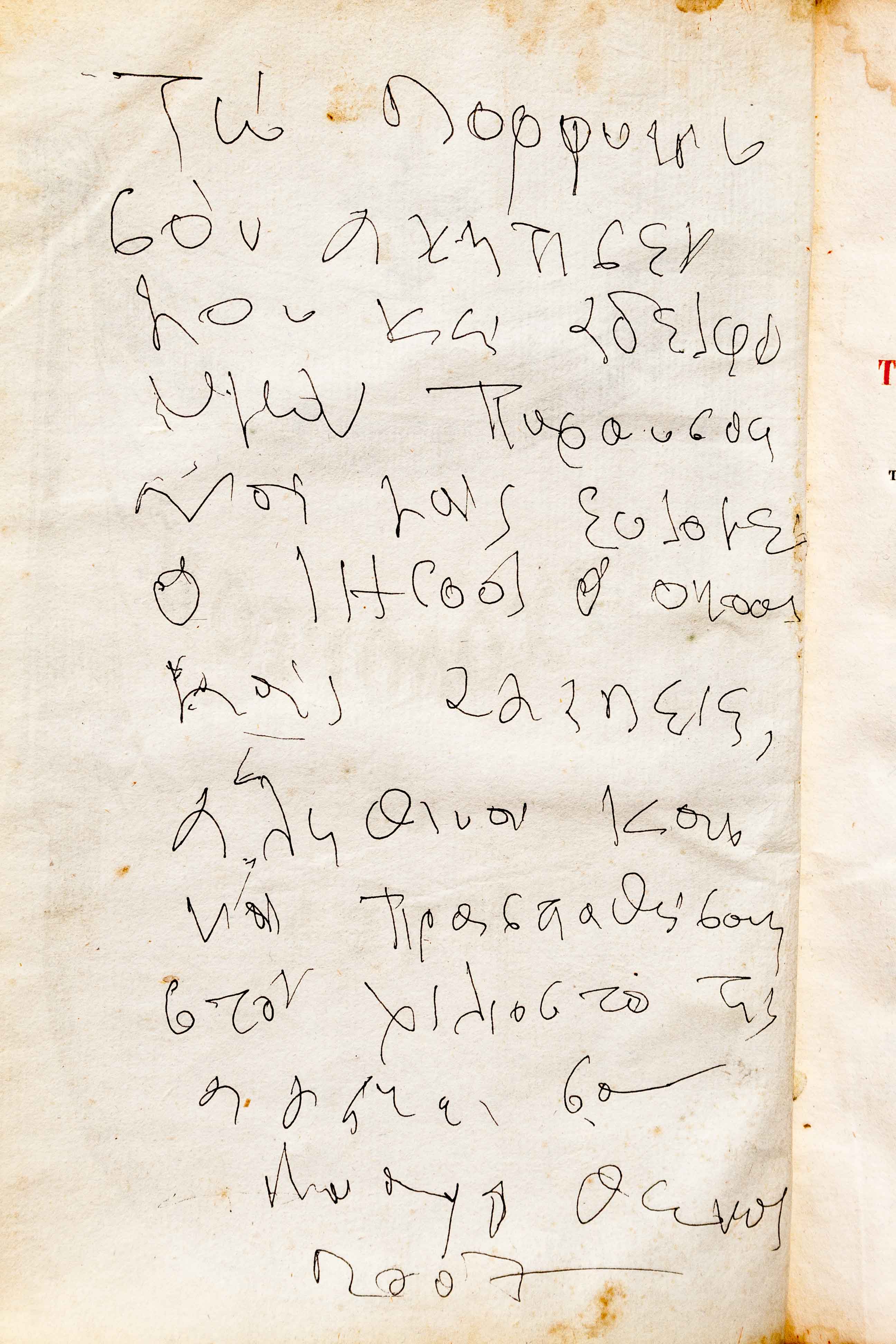 Abstract: Η στάχωση αποτελείται από ξύλινες πινακίδες επενδυμένες με δέρμα και ύφασμα. Έχουν χρησιμοποιηθεί φύλλα από προυπολογισμό εξόδων Υπουργείου έτους 1866, για τη στάχωση στην αρχή και στο τέλος (φωτ. 5258). Πριν τη σ.τ. αφιέρωση στον πατέρα Πορφύριο με ημερομηνία 2007 (φωτ. 5256). Σχόλιο: σ.τ. (φωτ. 5255). Αποτελεί μέρος (εγγραφή 88) της πτυχιακής εργασίας Τα παλαίτυπα της Ιεράς Μονής Τιμίου Προδρόμου Βεροίας, της Ευθυμίας Αθανασιάδου, φοιτήτριας του Τμήματος Βιβλιοθηκονομίας και Συστημάτων Πληροφόρησης ΑΤΕΙΘ.