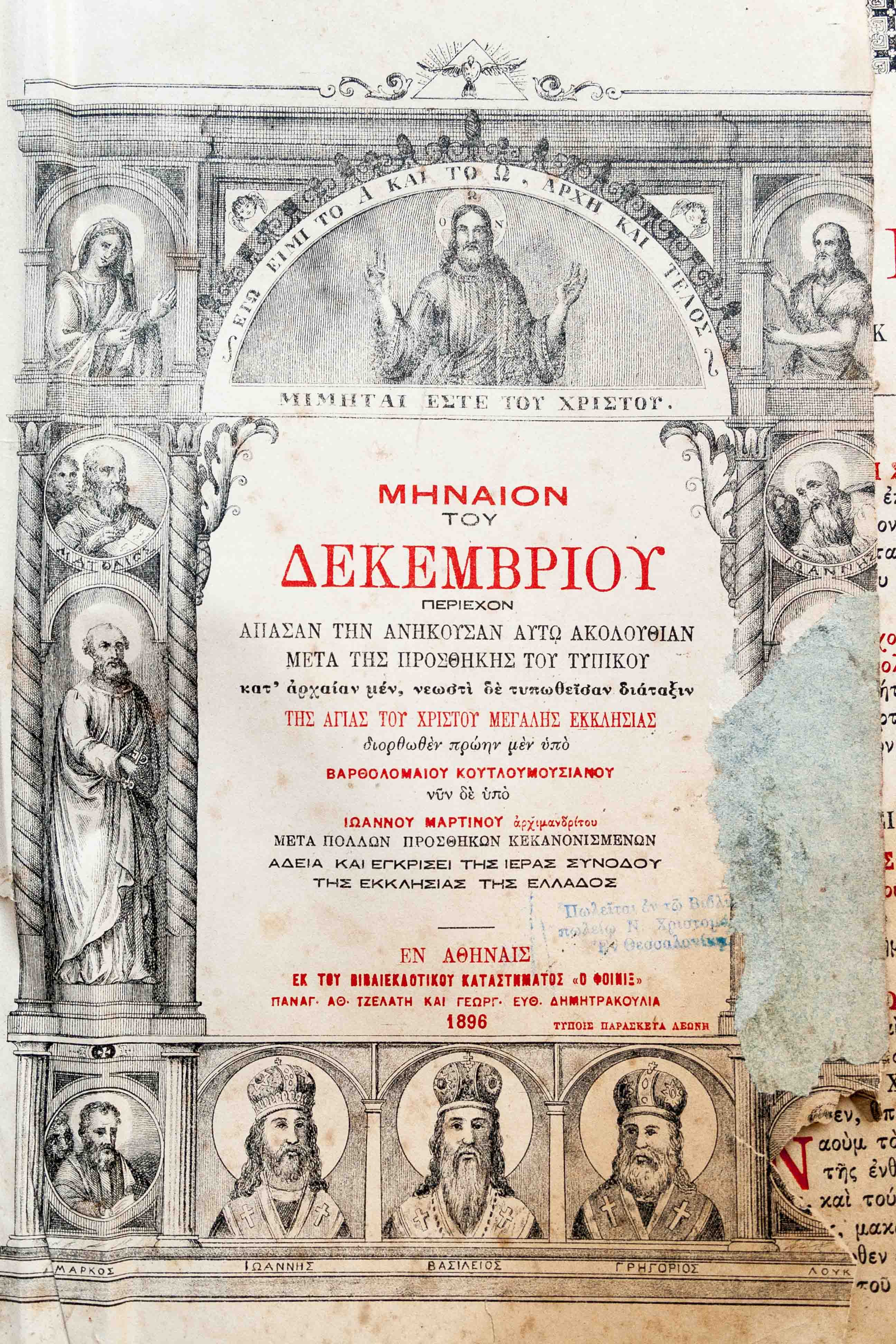 Μηναῖον τοῦ Δεκεμβρίου : περιέχον ἅπασαν τὴν ἀνήκουσαν αὐτῷ Ἀκολουθίαν μετὰ τῆς προσθήκης τοῦ Τυπικοῦ κατ’ ἀρχαίαν μέν, νεωστὶ δὲ τυπωθεῖσαν διάταξιν τῆς ἁγίας τοῦ Χριστοῦ Μεγάλης Ἐκκλησίας