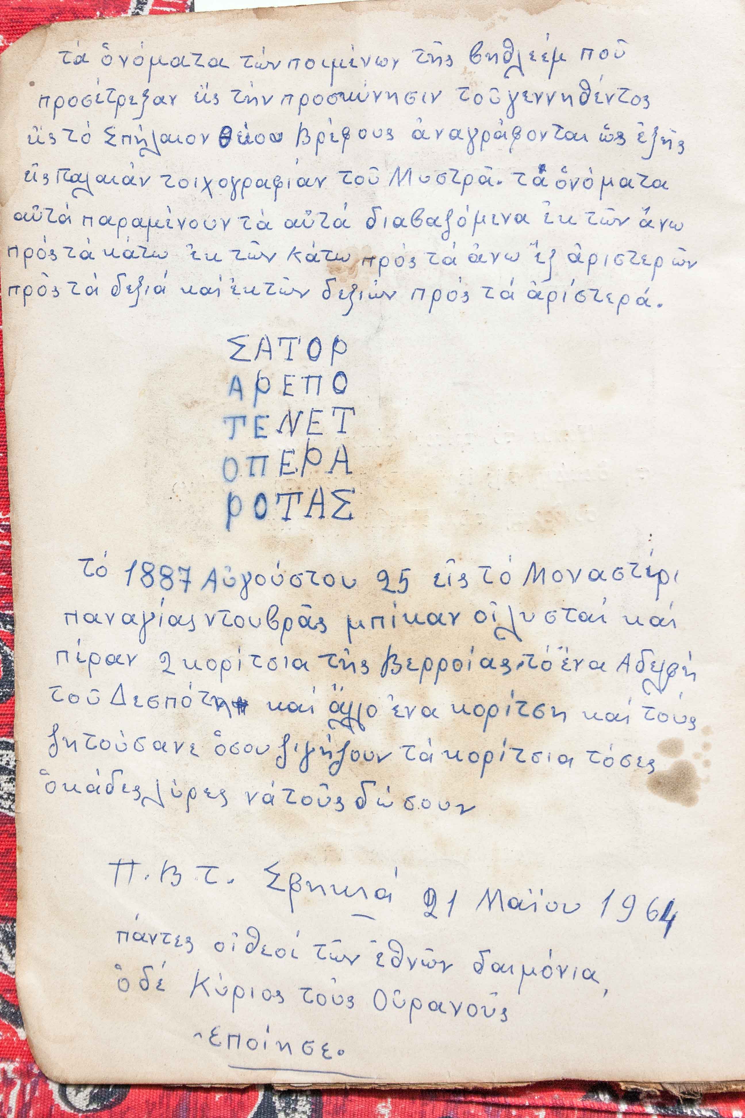 | Abstract: | Η στάχωση αποτελείται από πινακίδες χαρτονιού με υφασμάτινη επικάλυψη. Στο verso της σ.τ.: τα ονόματα των ποιμένων της Βηθλεέμ που αναγράφονται σε παλαιά τοιχογραφία στο Μυστρά με τέτοιο τρόπο ώστε να διαβάζονται από όλες τις κατευθύνσεις, και ενθύμηση με ημερομηνία 1887 για αρπαγή δύο κοριτσιών από ληστές στο μοναστήρι Παναγίας Δοβρά (φωτ. 5261). Στη σ. 3: εικ. και ενθύμηση Προκοπίου ιερομονάχου (φωτ. 5262). Στη σ. 68 δύο αποσπάσματα των: Ανδρέας ο Κρήτης και Χρυσόστομος (φωτ. 5259). Σχόλιο: σ.τ. (φωτ. 5260). Αποτελεί μέρος (εγγραφή 124) της πτυχιακής εργασίας Τα παλαίτυπα της Ιεράς Μονής Τιμίου Προδρόμου Βεροίας, της Ευθυμίας Αθανασιάδου, φοιτήτριας του Τμήματος Βιβλιοθηκονομίας και Συστημάτων Πληροφόρησης ΑΤΕΙΘ. |