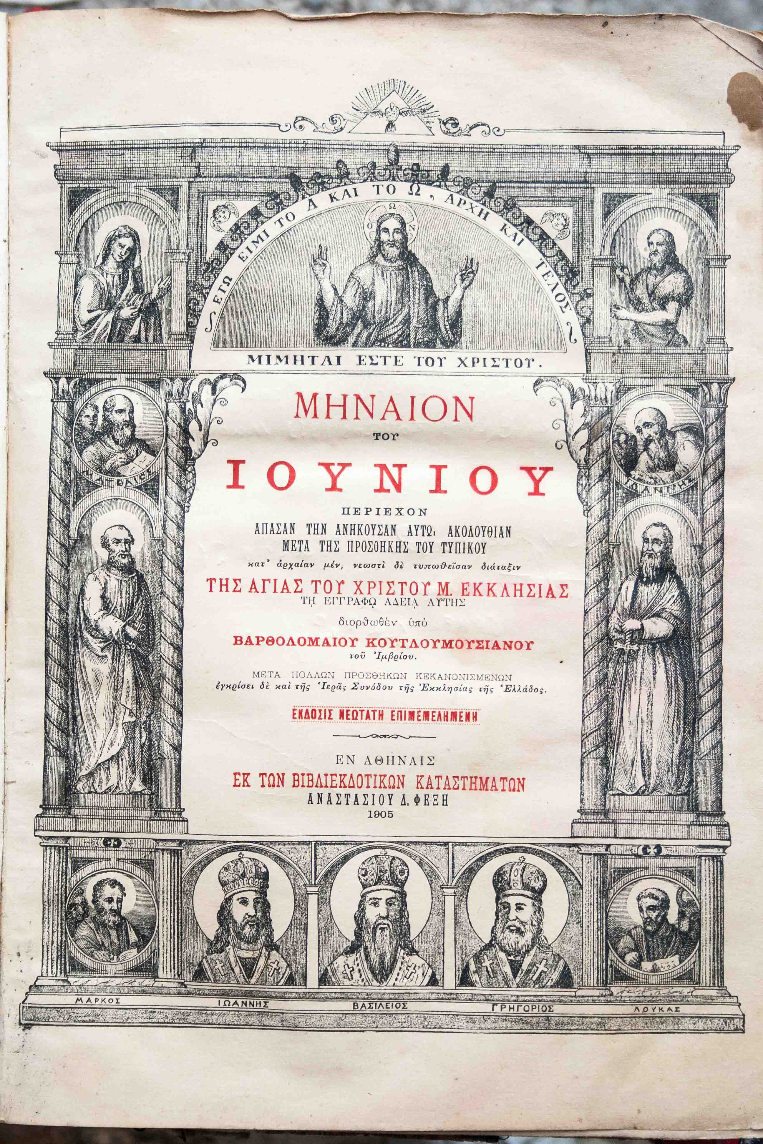Μηναῖον τοῦ Ἰουνίου : περιέχον ἅπασαν τὴν ἀνήκουσαν αὐτῷ Ἀκολουθίαν μετὰ τῆς προσθήκης τοῦ Τυπικοῦ κατ’ ἀρχαίαν μέν, νεωστὶ δὲ τυπωθεῖσαν διάταξιν τῆς ἁγίας τοῦ Χριστοῦ Μ. Ἐκκλησίας τῇ ἐγγράφῳ ἀδείᾳ αὐτῆς