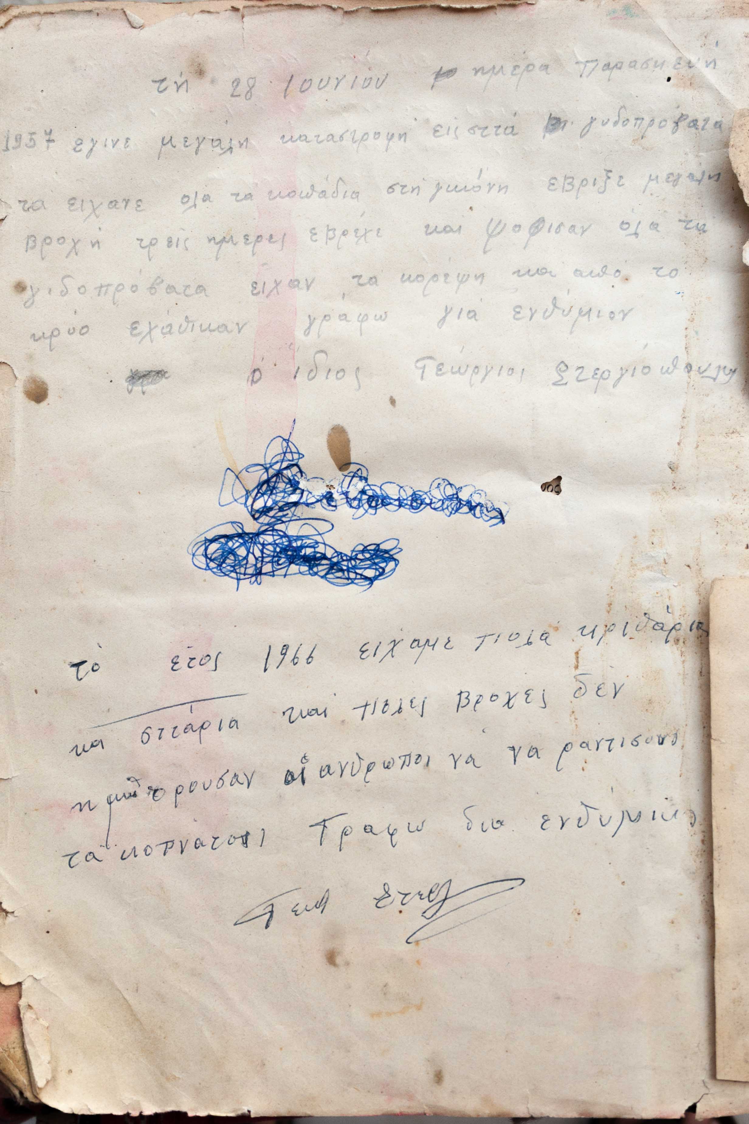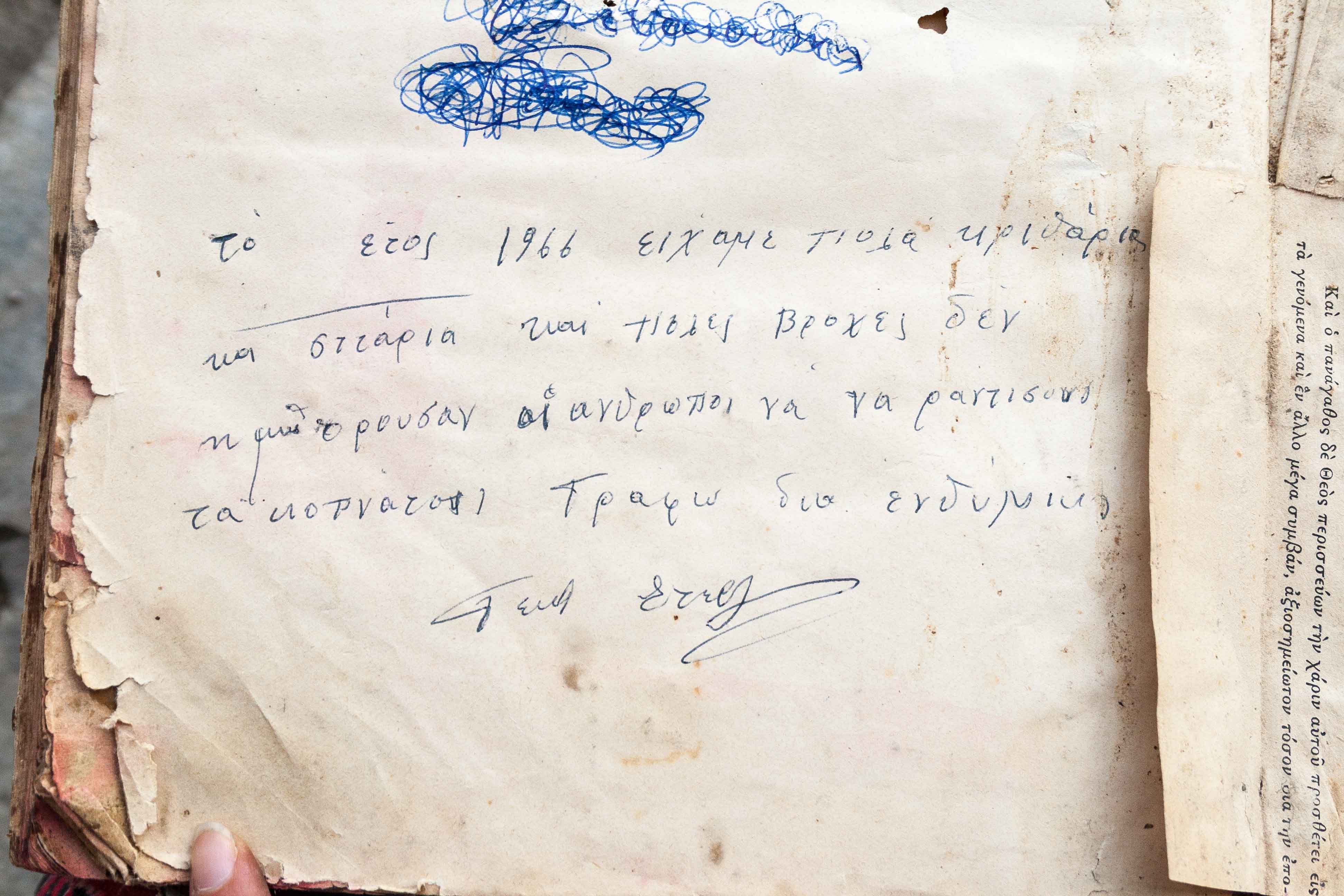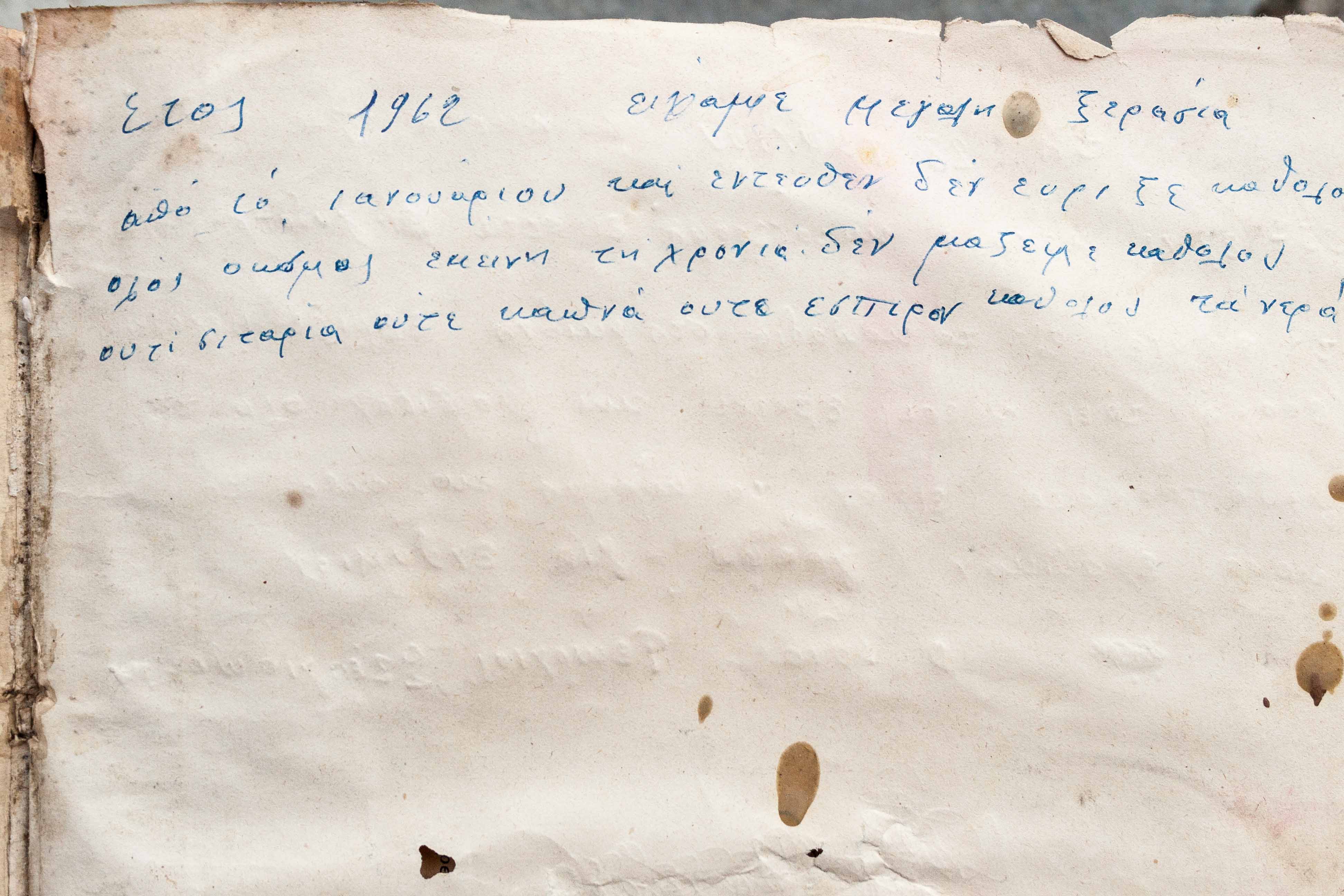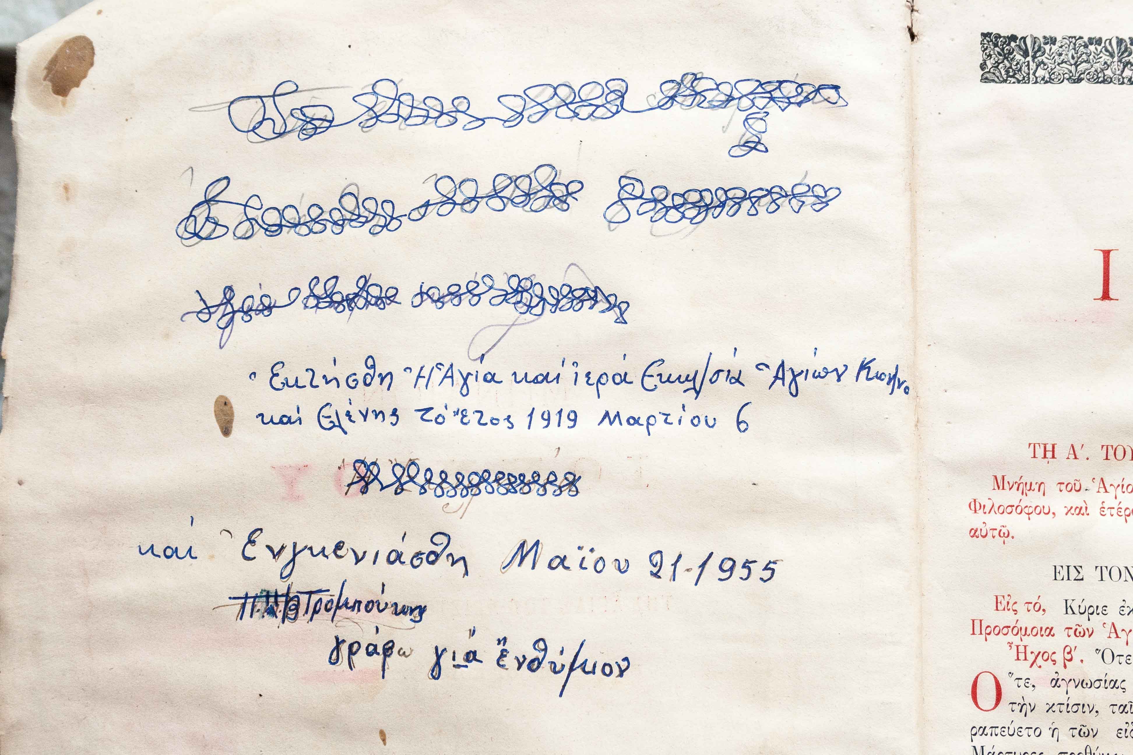 | Abstract: | Η στάχωση αποτελείται από πινακίδες χαρτονιού και λίγο δέρμα στη ράχη. Έχει γίνει προσπάθεια αποκατάστασης. Έχουν χρησιμοποιηθεί σ. από άλλο βιβλίο Ευαγγελικά διδάγματα, για τη στάχωση. Στο verso της σ.τ. ενθύμηση ενυπόγραφη για το χτίσιμο της εκκλησίας Κων/νου και Ελένης με ημερομηνία 1919 και τα εγκαίνια με ημερομηνία 1955 (φωτ. 5085). Στα παράφυλλα του τέλους ενθυμήσεις ενυπόγραφες με ημερομηνίες 1957 και 1966 για μεγάλη βροχή και τις καταστροφές που προκάλεσε στα γιδοπρόβατα και στις καλλιέργιες (φωτ. 5080, 5084). Eνθύμηση με ημερομηνία 1962 για ξηρασία, στα παράφυλλα του τέλους (φωτ. 5083). Λείπουν όλες οι σ. μετά τη σ. 120. Σχόλιο: σ.τ. (φωτ. 0572). Σχόλιο: δεν φαίνεται να ανήκει στα παλαίτυπα της Μονής. Αποτελεί μέρος (εγγραφή 133) της πτυχιακής εργασίας Τα παλαίτυπα της Ιεράς Μονής Τιμίου Προδρόμου Βεροίας, της Ευθυμίας Αθανασιάδου, φοιτήτριας του Τμήματος Βιβλιοθηκονομίας και Συστημάτων Πληροφόρησης ΑΤΕΙΘ. |