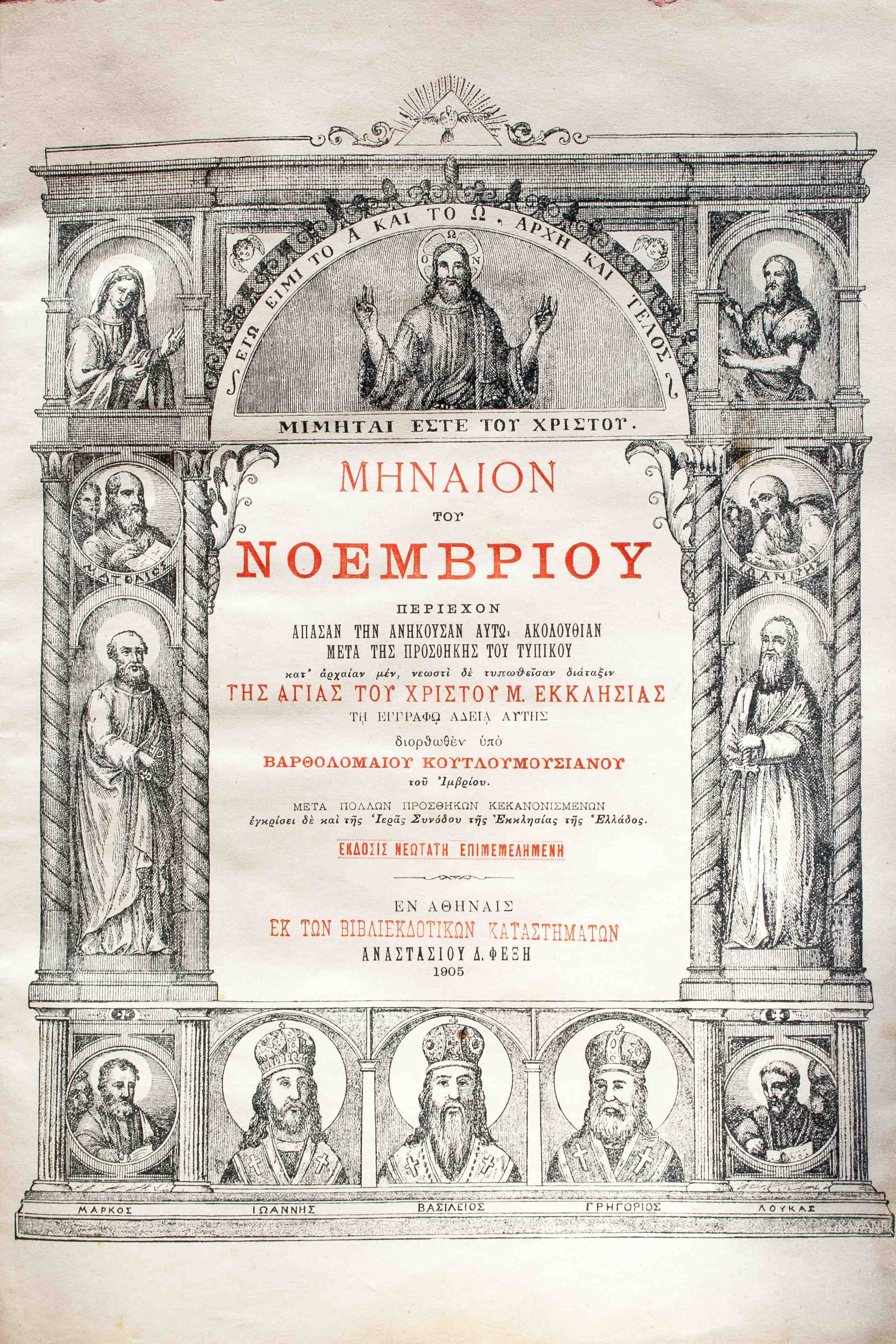 Μηναῖον τοῦ Νοεμβρίου : περιέχον ἅπασαν τὴν ἀνήκουσαν αὐτῷ Ἀκολουθίαν μετὰ τῆς προσθήκης τοῦ Τυπικοῦ κατ’ ἀρχαίαν μέν, νεωστὶ δὲ τυπωθεῖσαν διάταξιν τῆς ἁγίας τοῦ Χριστοῦ Μ. Ἐκκλησίας τῇ ἐγγράφῳ ἀδείᾳ αὐτῆς