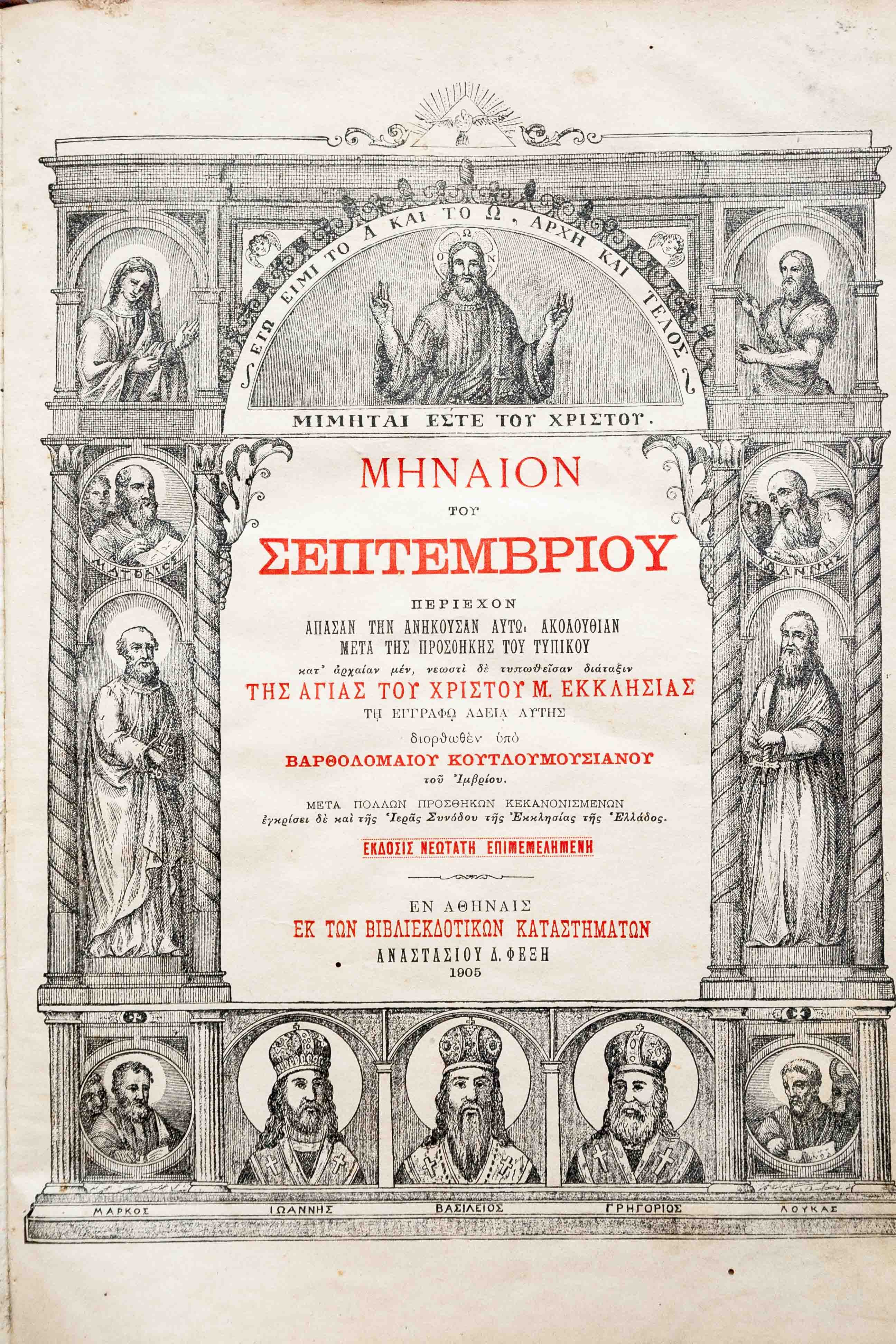 Μηναῖον τοῦ Σεπτεμβρίου : περιέχον ἅπασαν τὴν ἀνήκουσαν αὐτῷ Ἀκολουθίαν μετὰ τῆς προσθήκης τοῦ Τυπικοῦ κατ’ ἀρχαίαν μέν, νεωστὶ δὲ τυπωθεῖσαν διάταξιν τῆς ἁγίας τοῦ Χριστοῦ Μ. Ἐκκλησίας τῇ ἐγγράφῳ ἀδείᾳ αὐτῆς