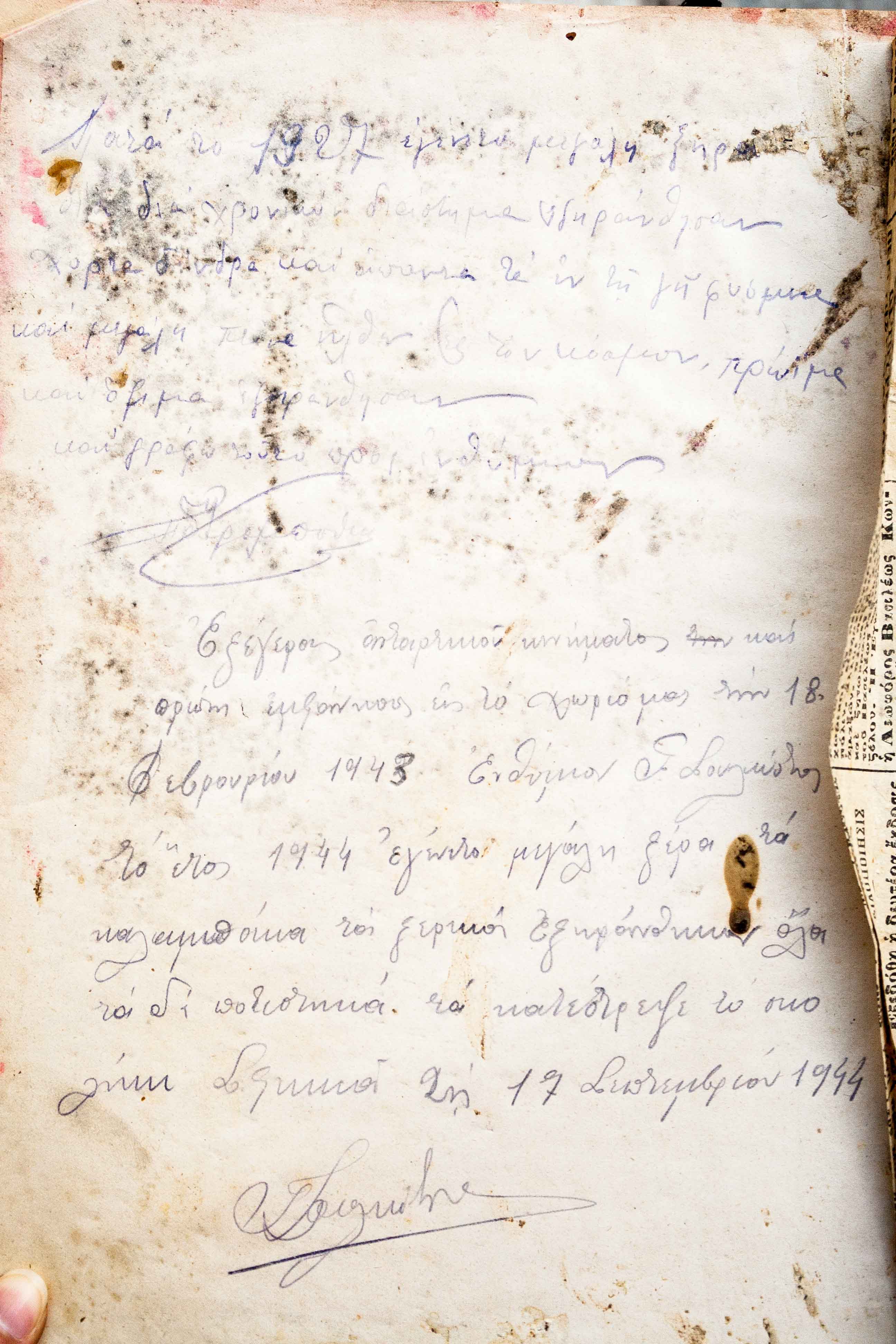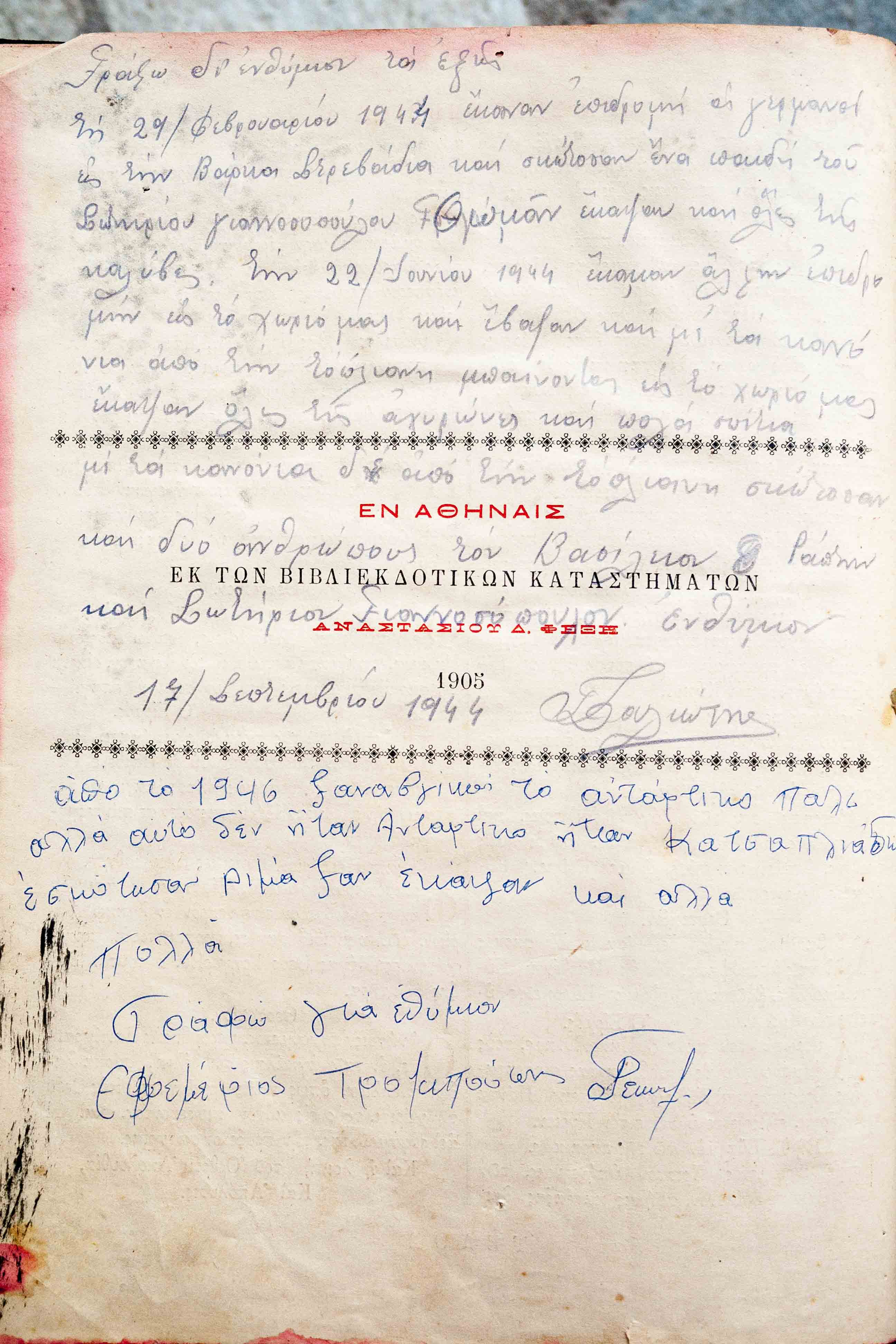 | Abstract: | Η στάχωση αποτελείται από πινακίδες χαρτονιού με υφασμάτινη επικάλυψη και δέρμα. Έχει γίνει προσπάθεια αποκατάστασης. Έχουν χρησιμοποιηθεί σ. από εφημερίδα Μακεδονία, για τη στάχωση στην αρχή (φωτ. 5064, 5065, 5066). Ενθύμηση ενυπόγραφη από Αθανάσιο Ιωάννη Τρομπούκη στα παράφυλλα της αρχής για συμφωνία βιβλιοδεσίας (φωτ. 5063). Ενθυμήσεις στα παράφυλλα τους τέλους: για μεγάλη ξηρασία με ημερομηνία 1927, για εξέγερση αντάρτικου κινήματος με ημερομηνία 1943 και ξηρασία με ημερομηνία 1944 (φωτ. 5061). Ενθυμήσεις ενυπόγραφες από Σουλιώτη και εφημέριο Τρομπούκη στα παράφυλλα του τέλους: για δύο επιδρομές Γερμανών με ημερομηνία 1944, ονόματα νεκρών και αντάρτικο με ημερομηνία 1946 (φωτ. 5062). Σχόλιο: σ.τ. (φωτ. 0561). Σχόλιο: δεν φαίνεται να ανήκει στα παλαίτυπα της Μονής. Σχόλιο: η στάχωση ίδια με Μηναίο Δεκεμβρίου 1905 και Μηναίο Νοεμβρίου 1905. Σχόλιο: τις ενθυμήσεις της φωτ. 5061 τις υπογράφουν πιθανόν οι Τρομπούκης και Σουλιώτης. Αποτελεί μέρος (εγγραφή 138) της πτυχιακής εργασίας Τα παλαίτυπα της Ιεράς Μονής Τιμίου Προδρόμου Βεροίας, της Ευθυμίας Αθανασιάδου, φοιτήτριας του Τμήματος Βιβλιοθηκονομίας και Συστημάτων Πληροφόρησης ΑΤΕΙΘ. |